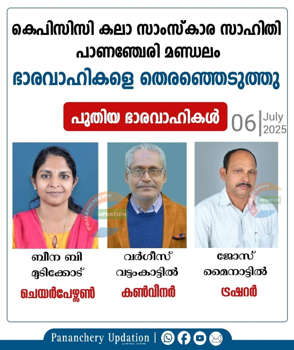 കെപിസിസി കലാ സാംസ്കാര സാഹിതി പാണഞ്ചേരി മണ്ഡലം ചെയർപേഴ്സൺ ആയി ബീന ബി മുടിക്കോടിനെ തെരഞ്ഞെടുത്തു. കൺവീനർ വർഗീസ് വട്ടംകാട്ടിലിനെയും , ട്രഷററായി ജോസ് മൈനാട്ടിലിനെയും നിയമിച്ചതായി സംസ്കാര സാഹിതി തൃശൂർ ജില്ലാ ചെയർമാൻ ഗിന്നസ് സത്താർ ആദൂർ, ജില്ല കൺവീനർ അനിൽ സമ്രാട്ട് എന്നിവർ അറിയിച്ചു. പാണഞ്ചേരിയിലെ പൊതുപ്രവർത്തന രംഗത്ത് വ്യത്യസ്ത മേഖലയിൽ സജീവമായി പ്രവർത്തിക്കുന്നവരും കലാരംഗത്തുള്ളവരുമാണ് ഭാരവാഹികളായി തെരഞ്ഞെടുക്കപ്പെട്ട മൂന്നുപേരും.
