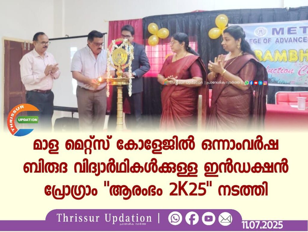 തൃശ്ശൂർ മാള മെറ്റ്സ് കോളേജ് ഓഫ് അഡ്വാൻസ്ഡ് സ്റ്റഡീസിലെ നാലുവർഷ ബിരുദ കോഴ്സിലെ ഒന്നാം വർഷ വിദ്യാർത്ഥികളുടെ ഇൻഡക്ഷൻ പ്രോഗ്രാം “ആരംഭം 2K25” മാള എജുക്കേഷണൽ ട്രസ്റ്റ് ചെയർമാൻ ഡോ. ഷാജു ആന്റണി ഐയിനിക്കൽ നിലവിളക്ക് കൊളുത്തി ഉദ്ഘാടനം ചെയ്തു. മെറ്റ്സ് ഗ്രൂപ്പ് ഓഫ് ഇൻസ്റ്റിറ്റ്യൂഷൻസ് സിഇഒ പ്രൊഫ. (ഡോ.) ജോർജ്ജ് കോലഞ്ചേരി ചടങ്ങിൽ അധ്യക്ഷത വഹിച്ചു. കൂടാതെ അദ്ദേഹം വിദ്യാർത്ഥികൾക്കും രക്ഷിതാക്കൾക്കും ആയി ക്ലാസ് എടുക്കുകയും ചെയ്തു. അക്കാദമിക് ഡയറക്ടർ ഡോ. എ. സുരേന്ദ്രൻ, സ്റ്റുഡൻസ് യൂണിയൻ സെക്രട്ടറി ആദിൽ റിഫായിൻ തുടങ്ങിയവർ ആശംസകൾ അർപ്പിച്ചു സംസാരിച്ചു. മെറ്റ്സ് കോളേജ് ഓഫ് അഡ്വാൻസ്ഡ് സ്റ്റഡീസ് പ്രിൻസിപ്പാൾ പ്രൊഫ. (ഡോ.) ഫോൺസി ഫ്രാൻസിസ് ചടങ്ങിൽ സ്വാഗതം പറഞ്ഞു. മാനേജ്മെൻറ് വിഭാഗം മേധാവി പ്രൊ. രസീല പി എസ് കോളേജിലെ നിലവിലുള്ള നിയമങ്ങളും ചട്ടങ്ങളും വിവരിച്ചു. പ്ലേസ്മെന്റ് കോ- ഓർഡിനേറ്റർ ലിമ കെ ഡി, ലൈബ്രറിയൻ ഷിൻസി പി ജി , സിസ്റ്റം അഡ്മിനിസ്ട്രേറ്റർ മുഹമ്മദ് ഷമീൽ എം.എ., കായിക വിഭാഗം മേധാവി സനീഷ് കെ.എം., എൻ. എസ്. എസ്. പ്രോഗ്രാം ഓഫീസർ ശ്രീലക്ഷ്മി സി.എസ്, തുടങ്ങിയവർ അവരവരുടെ വകുപ്പുകളുടെ പ്രവർത്തനങ്ങളെക്കുറിച്ച് സംസാരിച്ചു. സീനിയർ വിദ്യാർത്ഥികളുടേയും നവാഗത വിദ്യാർഥിയുടെയും വിവിധ കലാപ്രകടനങ്ങളും അരങ്ങേറി. നവാഗതരായ മുഴുവൻ വിദ്യാർത്ഥികളും രക്ഷിതാക്കളും സജീവമായി പങ്കെടുത്തു. പ്രോഗ്രാം കോർഡിനേറ്ററും കോമേഴ്സ് വിഭാഗം മേധാവിയുമായ പ്രൊഫ. രാജി ഹരി നന്ദി പ്രകാശിപ്പിച്ചു.