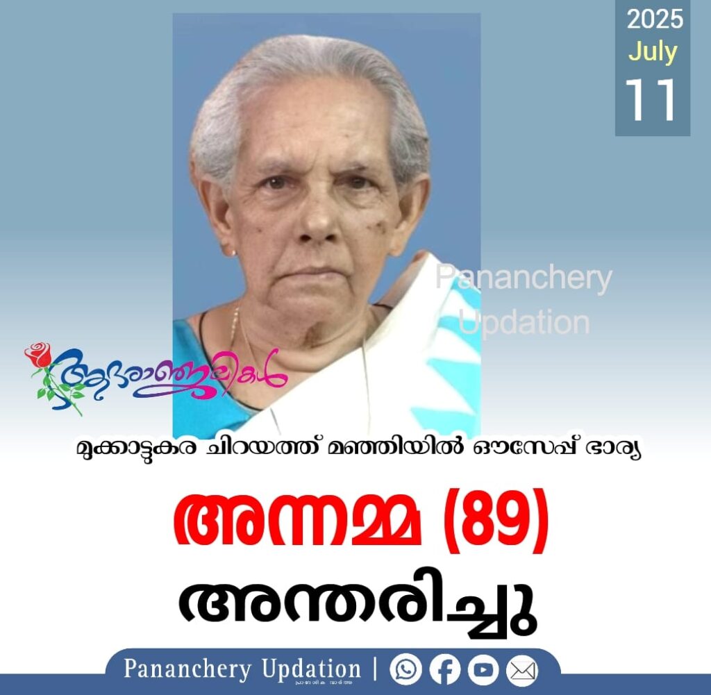 നെട്ടിശ്ശേരി മുക്കാട്ടുകര പരേതനായ ചിറയത്ത് മഞ്ഞിയിൽ ഔസേപ്പ് ഭാര്യ അന്നമ്മ – (89 – കെട്ടേക്കാട് കൊള്ളന്നൂർ തറയിൽ കുടുംബാംഗം) അന്തരിച്ചു. സംസ്കാരം ഇന്ന് (11-07-2025) വെള്ളിയാഴ്ച ഉച്ചതിരിഞ്ഞ് 4.00 മണിക്ക് മുക്കാട്ടുകര സെന്റ് ജോർജ്ജസ്സ് പള്ളിയിൽ. മക്കൾ : പോളി (Late), സെബാസ്റ്റ്യൻ ,ജോൺ, ടോണി, അൽഫോൻസ ,സോജൻ ,സോഫി,ജോസ്ഫീന. മരുമക്കൾ : സോജ, ജാൻസി ,റോസ്മി, ലീന,ജോസ് ,മഞ്ജു ,ജോജു ,ജോൺ