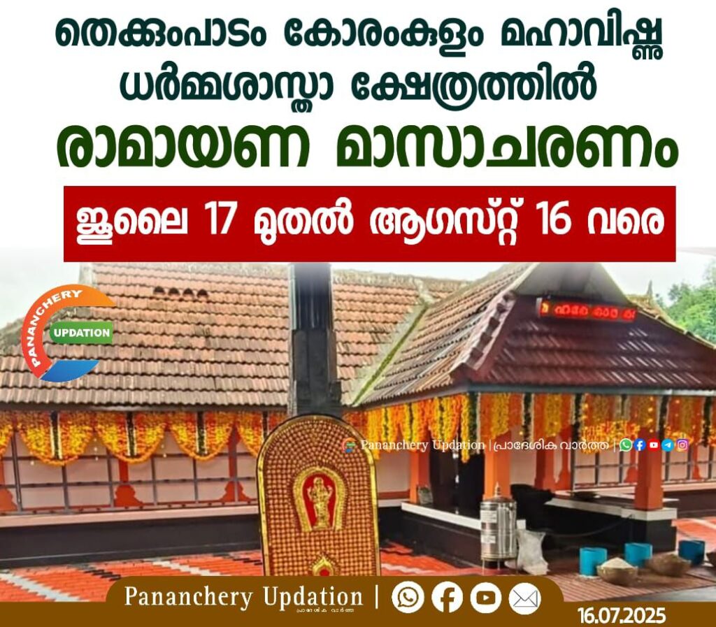 തെക്കുംപാടം കോരംകുളം മഹാവിഷ്ണു ധർമ്മശാസ്താ ക്ഷേത്രത്തിൽ രാമായണ മാസാചരണം ജൂലൈ 17 മുതൽ ആഗസ്റ്റ് 16 വരെ
