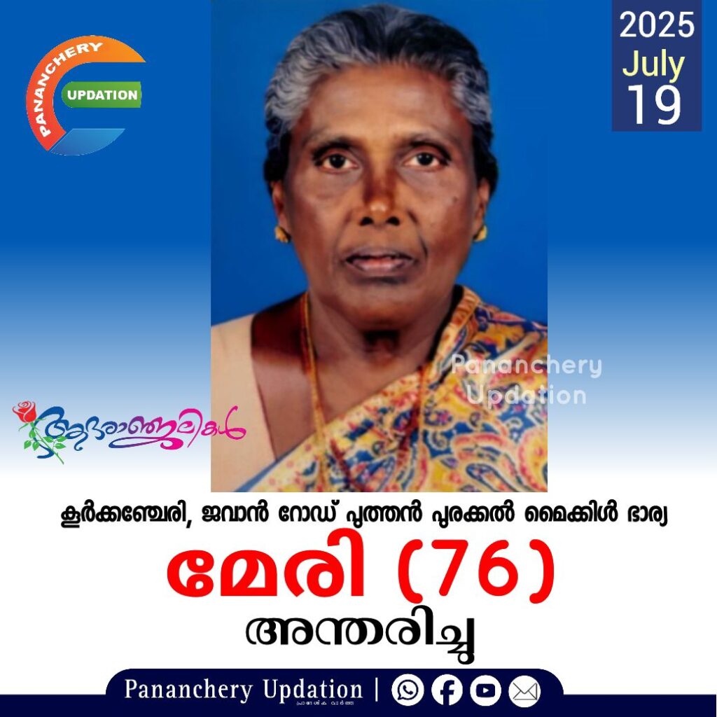 കൂർക്കഞ്ചേരി, ജവാൻ റോഡ് പുത്തൻ പുരക്കൽ മൈക്കിൾ ഭാര്യ മേരി (76) അന്തരിച്ചു. സംസ്കാരം ഇന്ന് (19-07-2025 ശനിയാഴ്ച) ഉച്ചതിരിഞ്ഞ് 3.00 മണിക്ക് തിരുഹൃദയ ലത്തിൻ പള്ളിയിൽ (മിഷൻ ക്വാർട്ടേഴ്സ്, തൃശ്ശൂർ)