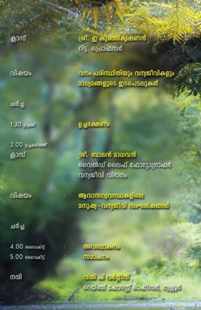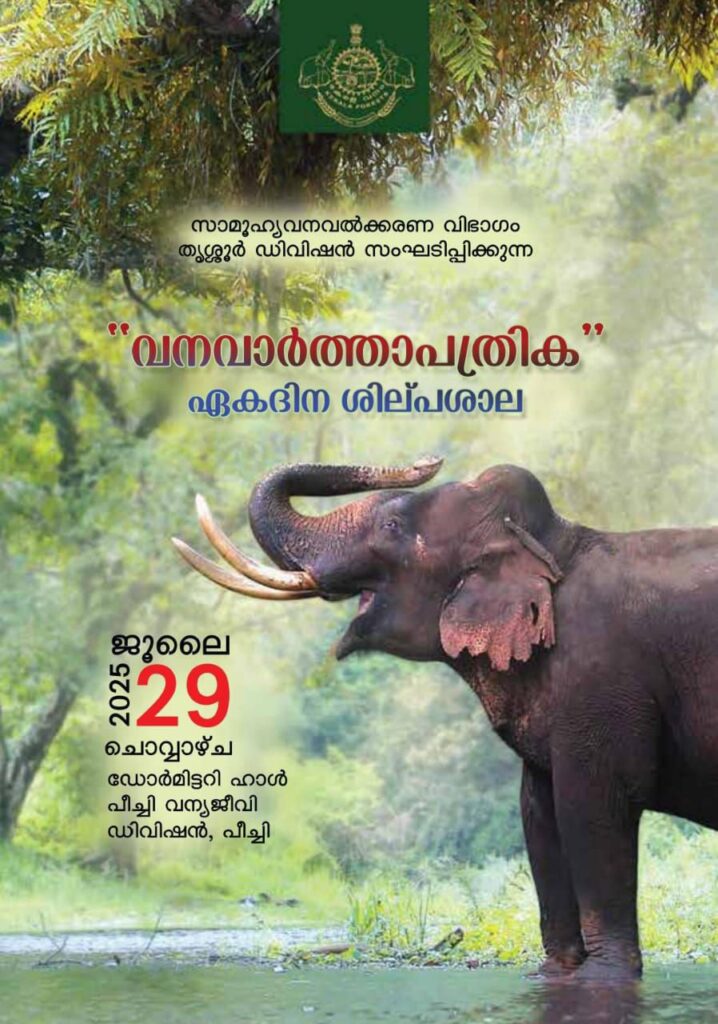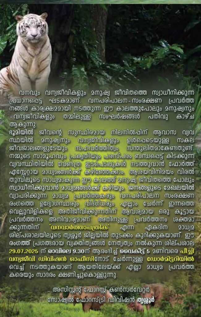ഭൂമിയിൽ ജീവൻറെ സുസ്ഥിരമായ നിലനിൽപ്പിന് ആവാസ വ്യവ സ്ഥയിൽ മനുഷ്യനും വന്യജീവികളും ഉൾപ്പെടെയുള്ള സകല ജീവജാലങ്ങളുടേയും സഹവർത്തിത്വം സന്തുലിതമാകേണ്ടതുണ്ട്. നമ്മുടെ സാമൂഹവും പ്രകൃതിയും പരസ്പരം ബന്ധപ്പെട്ട് കിടക്കുന്ന വ്യവസ്ഥിതിയിൽ വേണ്ടത്ര ഇടപെടലുകൾ നടത്തുവാൻ ഫോർത്ത് എസ്റ്റേറ്റായ മാധ്യമങ്ങൾക്ക് കഴിഞ്ഞേക്കാം. ആശയവിനിമയം വിരൽ തുമ്പിലൂടെ സാധ്യമാകുന്ന ഈ കാലത്ത് മനുഷ്യ ജീവിതത്തെ പോലും സ്വാധീനിക്കുവാൻ മാധ്യമങ്ങൾക്ക് കഴിയും ജനങ്ങളുടെ മേഖലയിൽ വ്യാപരിക്കുന്ന മാധ്യമ പ്രവർത്തകരും വനപരിപാലന സംരക്ഷണ രംഗത്തെ ഉദ്യോഗസ്ഥരും വിദ്ഗ്ധരും എല്ലാം ചേർന്ന് ഇന്നത്തെ വെല്ലുവിളികളെ അതിജീവിക്കുന്നതിന് ആവശ്യമായ ഒരു കൂട്ടായ പ്രവർത്തനം അനിവാര്യമാണ്. അതിനുള്ള പ്രവർത്തനം ശക്തമാക്കുന്നതിന് ‘വനവാർത്താപത്രിക’ എന്ന ഏകദിന മാധ്യമ ശില്പശാലയിലൂടെ തൃശ്ശൂർ ജില്ലയിൽ തുടക്കം കുറിക്കുകയാണ്. ഈ രംഗത്ത് പ്രഗത്ഭരായ വ്യക്തിത്വങ്ങൾ നേതൃത്വം നൽകുന്ന ശില്പശാല 29.07.2025 ന് രാവിലെ 9.30ന് ആരംഭിച്ച് വൈകീട്ട് 5 മണിവരെ പീച്ചി വന്യജീവി ഡിവിഷൻ ഓഫീസിനോട് ചേർന്നുള്ള ഡോർമിട്ടറിയിൽ നടത്തുന്നു