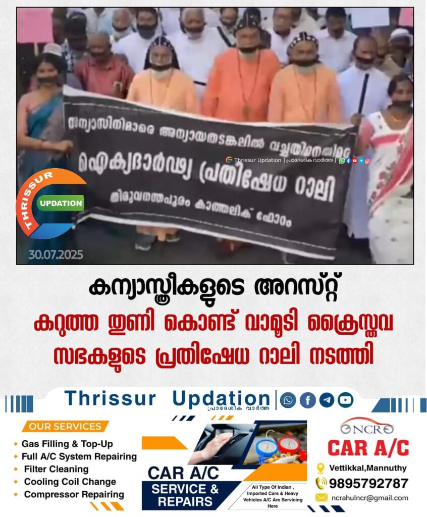 കന്യാസ്ത്രീകളുടെ അറസ്റ്റ്; കറുത്ത തുണി കൊണ്ട് വാമൂടി ക്രൈസ്തവ സഭകളുടെ റാലി