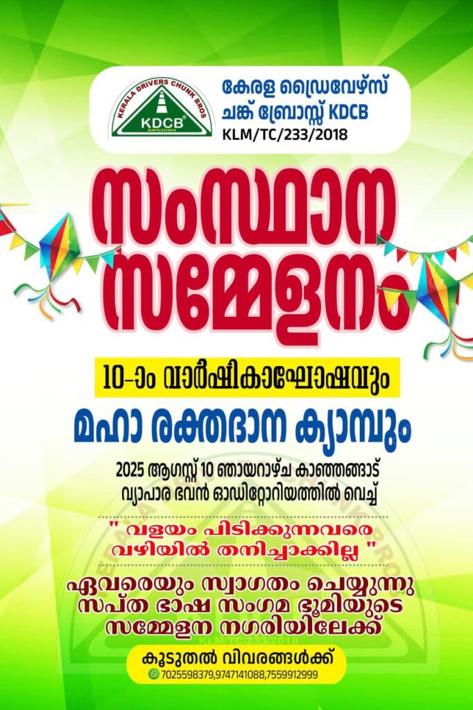കേരള ഡ്രൈവേഴ്സ് ചങ്ക് ബ്രോസ്സ് സംസ്ഥാന സമ്മേളനവും 10-ാം വാർഷികാഘോഷവും മഹാ രക്തദാന ക്യാമ്പും 2025 ആഗസ്റ്റ് 10 ഞായറാഴ്ച കാഞ്ഞങ്ങാട് വ്യാപാര ഭവൻ ഓഡിറ്റോറിയത്തിൽ വെച്ച് നടത്തുന്നു.