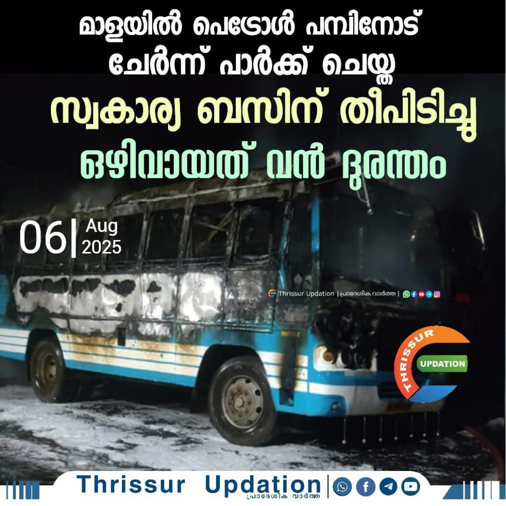 മാളയിൽ പെട്രോള് പമ്പിനോട് ചേര്ന്ന് പാര്ക്ക് ചെയ്ത സ്വകാര്യ ബസിന് തീപിടിച്ചു; ഒഴിവായത് വന് ദുരന്തം