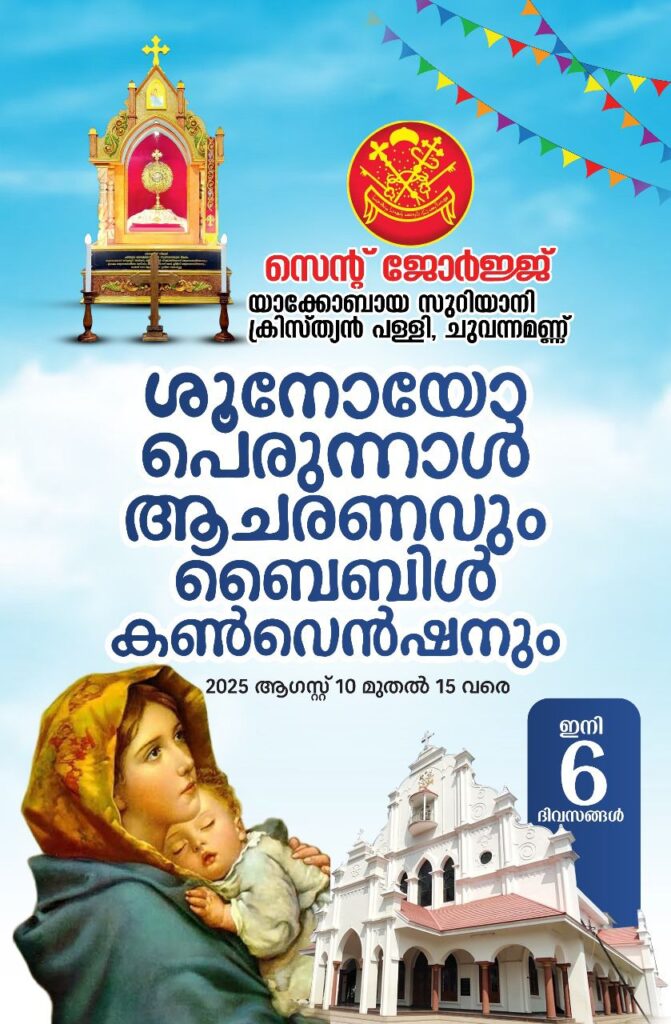 ചുവന്നമണ്ണ് സെന്റ് ജോർജ് യാക്കോബായ സുറിയാനി ക്രിസ്ത്യാനി പള്ളിയിൽ ശൂനോയോ പെരുനാൾ ആചരണവും ബൈബിൾ കൺവെൻഷനും ആഗസ്ത് 10 മുതൽ ആഗസ്ത 15 വരെ