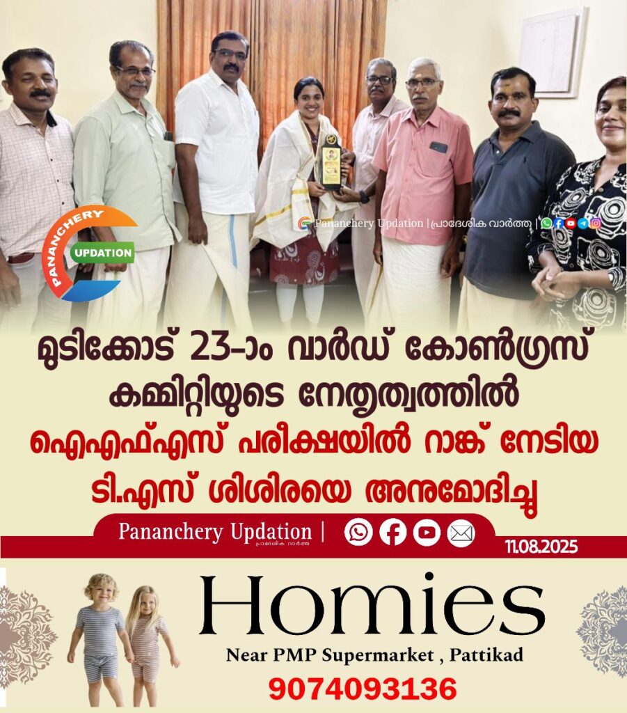 2024 ഇന്ത്യൻ ഫോറസ്റ്റ് സർവീസ് (ഐഎഫ്എസ്) പരീക്ഷയിൽ 87-ാം റാങ്ക് നേടിയ ടി.എസ് ശിശിരയെ മുടിക്കോട് വാർഡ് കോൺഗ്രസ് കമ്മിറ്റി അനുമോദിച്ചു. ഷിജോ പി. ചാക്കോ, കെ.ഐ ചാക്കുണ്ണി, സാബു മണപ്പുറത്ത്, പരമേശ്വരൻ കുറുമാമ്പുഴ, കബീർ താഴ്ത്ത് പറമ്പിൽ തുടങ്ങിയവർ പങ്കെടുത്തു.