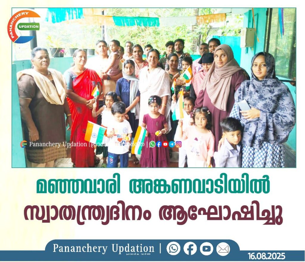 പാണഞ്ചേരി പഞ്ചായത്ത് വാർഡ് 8 മഞ്ഞവാരി അങ്കണവാടിയിൽ സ്വാതന്ത്ര്യദിനം ആഘോഷിച്ചു. വാർഡ് മെമ്പർ ഷീല അലക്സ് പതാക ഉയർത്തി.കുട്ടികൾ, രക്ഷിതാക്കൾ, A. L. M. S. C. അംഗങ്ങൾ, ആശാവർക്കർ, നാട്ടുകാർ എന്നിവർ പങ്കെടുത്തു. അംഗൻവാടി ടീച്ചർ ഷാനി നേതൃത്വം നൽകി. ഹെൽപ്പർ ലില്ലി നന്ദി പറഞ്ഞു.