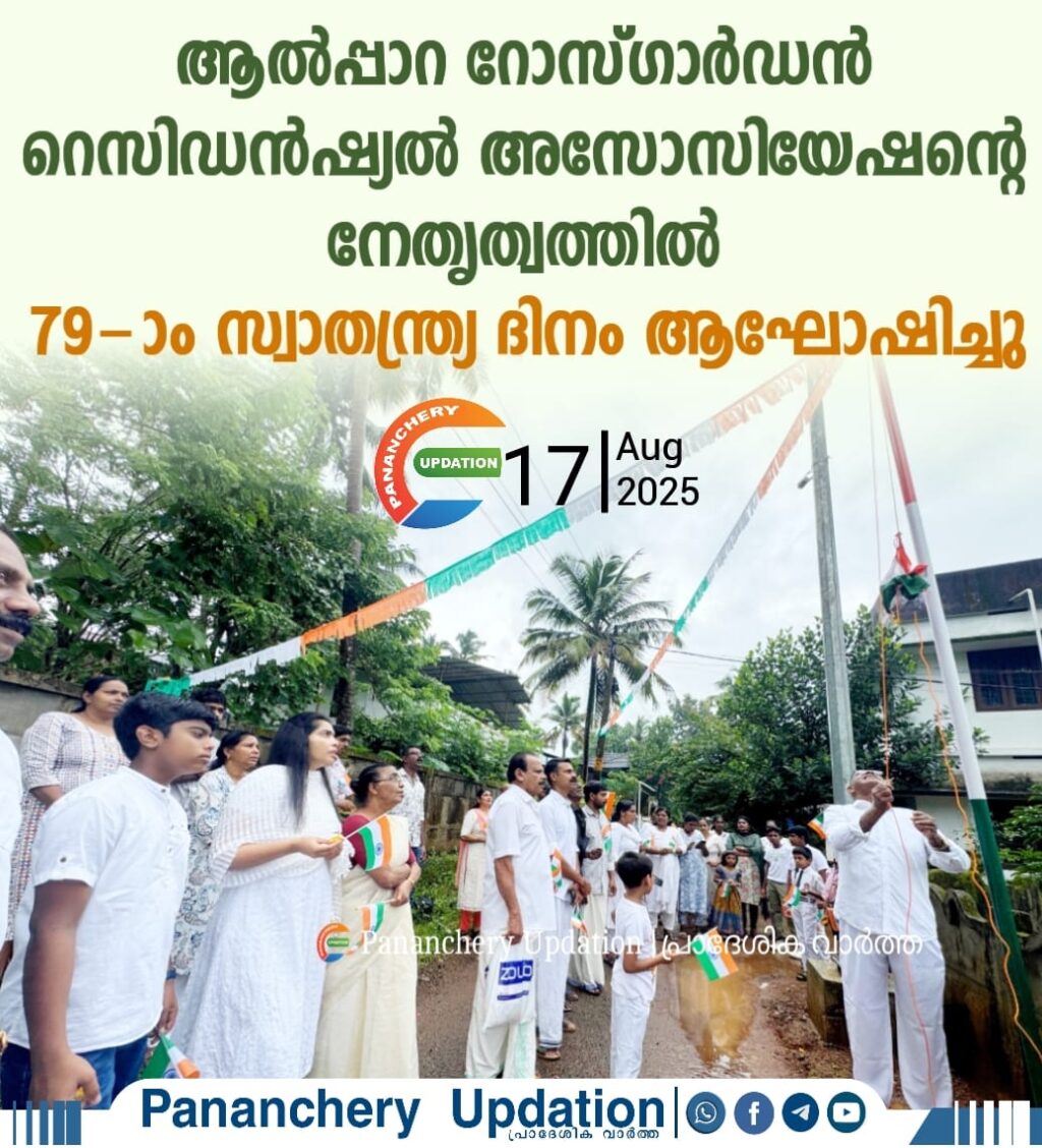 ആൽപ്പാറ റോസ് ഗാർഡൻ റെസിഡൻഷ്യൽ അസോസിയേഷൻ അങ്കണത്തിൽ നടന്ന ചടങ്ങിൽ അസോസിയേഷൻ പ്രസിഡൻ്റ് T J വർഗീസ് പതാക ഉയർത്തി. സെക്രട്ടറി ബിജി ജോയ് സ്വാതന്ത്ര്യദിന സന്ദേശം നൽകി. തുടർന്ന് മധുര പലഹാരം വിതരണം നടത്തി. മുഖ്യരക്ഷാധികാരി E V. പൗലോസ്. വൈസ് പ്രസിഡൻ്റ് ഏല്യമ്മ പൗലോസ്, ജോയിൻ സെക്രട്ടറി സനിൽകുമാർ, ട്രഷറർ വിജി സുരേഷ്. എക്സിക്യൂട്ടീവ് അംഗങ്ങൾ എന്നിവർ നേതൃത്വം നൽകി.