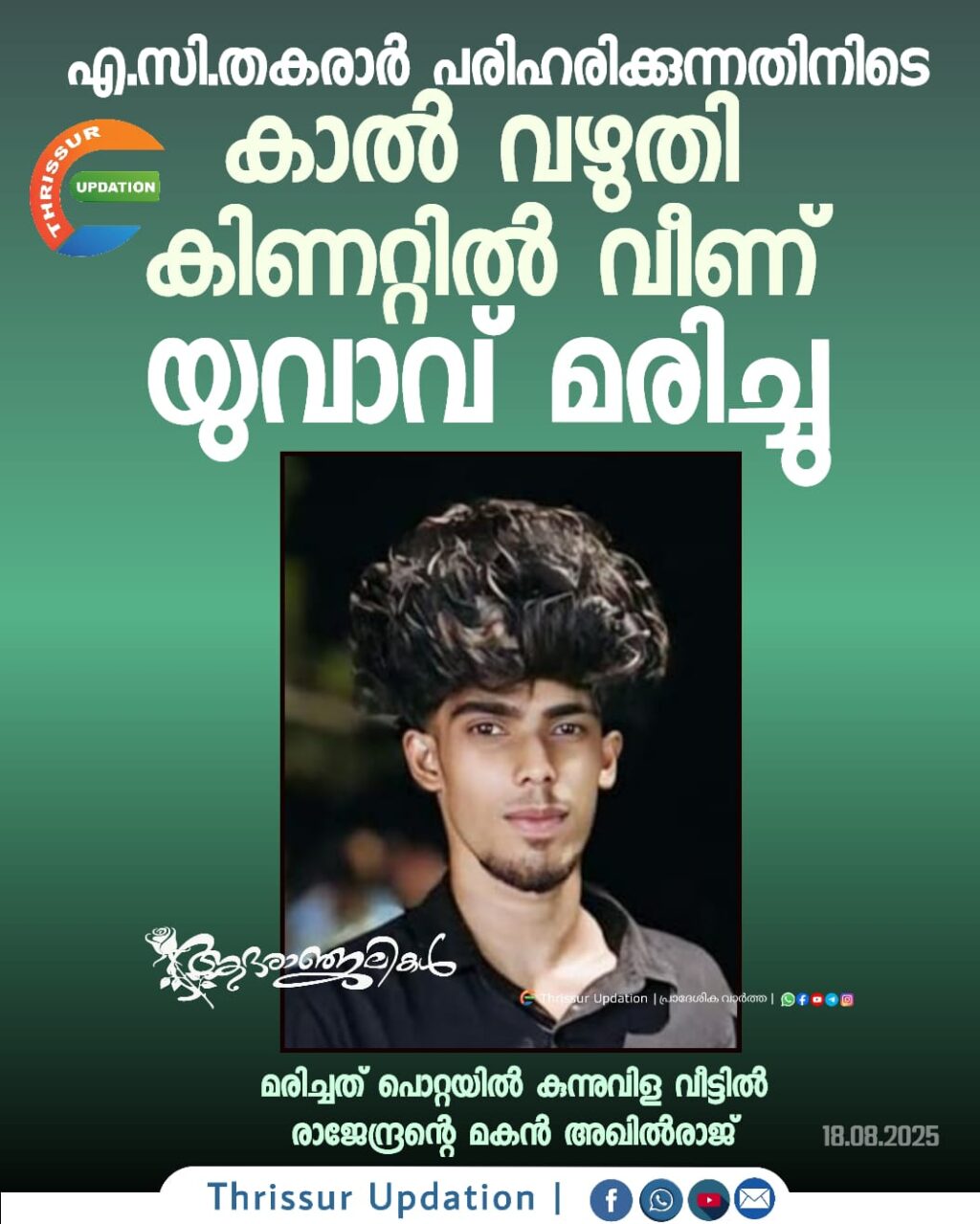 രാജേന്ദ്രന്റെ മകൻ അഖിൽരാജ്(21)കാൽ വഴുതി കിണറ്റിൽ വീണ് മരിച്ചു.