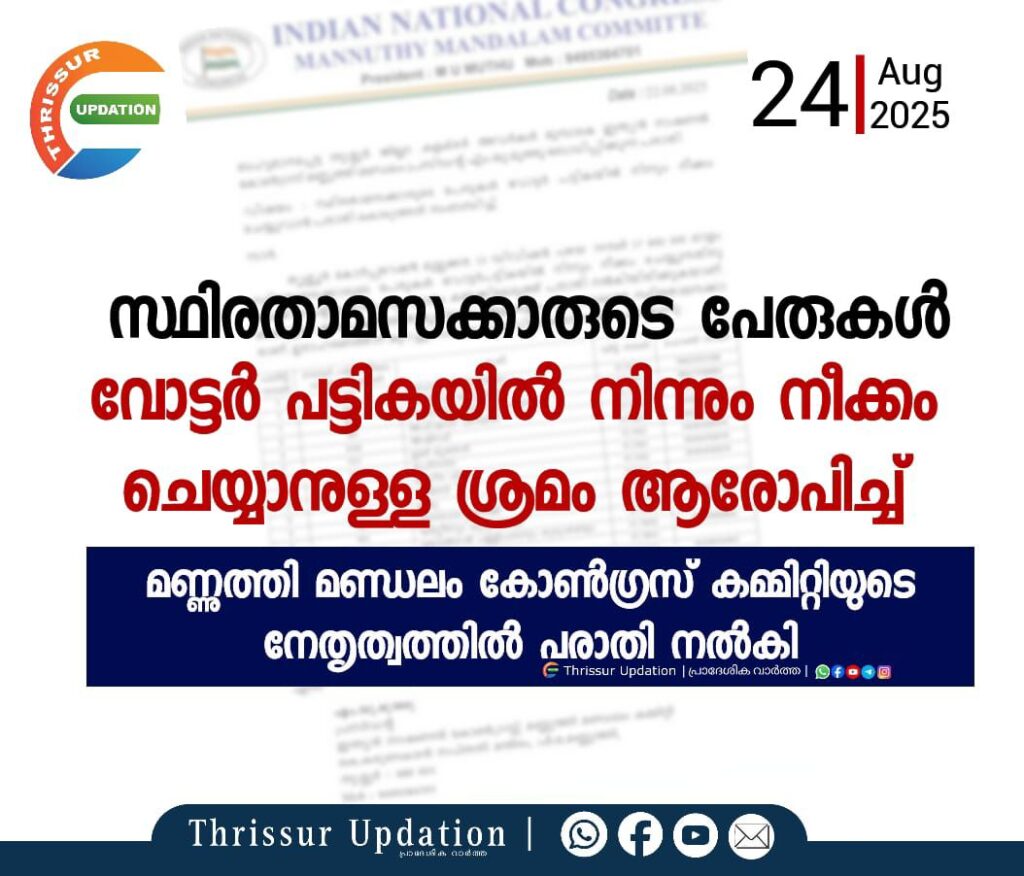തൃശ്ശൂർ കോർപ്പറേഷൻ 17 ഡിവിഷൻ മുല്ലക്കരയിലെ സ്ഥിരതാമസക്കാരായ അറുന്നൂറോളം പേരെ വോട്ടർ പട്ടികയിൽ നിന്ന് നീക്കം ചെയ്യുന്നതിന് വേണ്ടി സിപിഎം കൗൺസിലറുടെ നേതൃത്വത്തിലാണ് പരാതി നൽകിയിട്ടുള്ളത് എന്നാണ് ആരോപണം.
