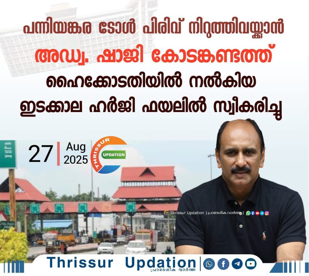 പന്നിയങ്കര ടോൾ പിരിവ് നിറുത്തിവയ്ക്കാൻ അഡ്വ. ഷാജി കോടങ്കണ്ടത്ത് ഹൈക്കോടതിയിൽ നൽകിയ ഇടക്കാല ഹർജി ഫയലിൽ സ്വീകരിച്ചു.