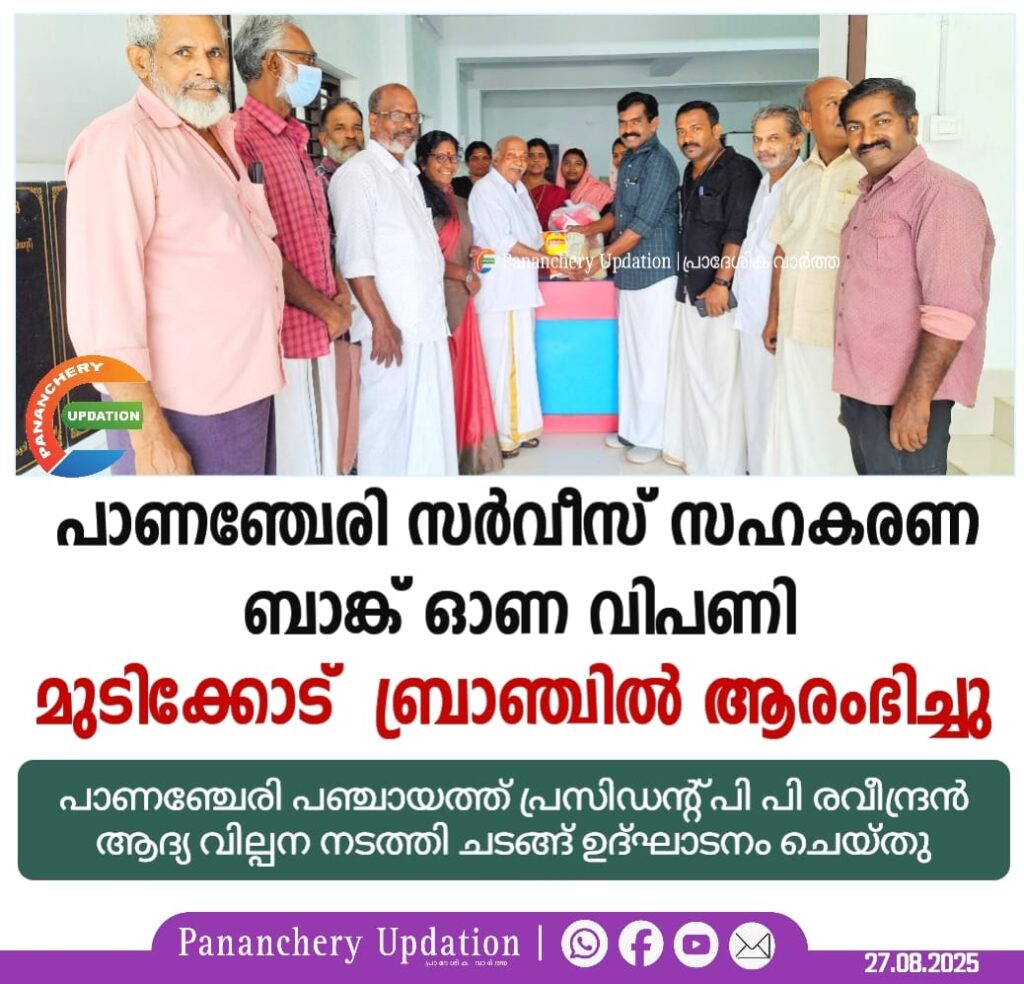 പാണഞ്ചേരി സർവീസ് സഹകരണ ബാങ്ക് ഓണ വിപണിയിൽ ഇടപെടുന്നതിന്റെ ഭാഗമായി നിത്യോപയോഗ സാധനങ്ങൾക്ക് സർക്കാർ സബ്സിഡിയോടുകൂടി ഓണം സഹകരണ വിപണി , മുടിക്കോട് ബ്രാഞ്ചിൽ ആരംഭിച്ചു. പാണഞ്ചേരി പഞ്ചായത്ത് പ്രസിഡൻ്റ് പി പി രവീന്ദ്രൻ ആദ്യ വില്പന നടത്തി ചടങ്ങ് ഉദ്ഘാടനം ചെയ്തു. പ്രസ്തുത ചടങ്ങിൽ പഞ്ചായത്ത് വൈസ് പ്രസിഡൻ്റ് സാവിത്രി സദാനന്ദൻ ,ബോർഡ് അംഗങ്ങളായ പ്രശോഭ്,സംഗീതൻ,അനിത, എന്നിവരും നാട്ടുകാരും സന്നിഹിതരായിരുന്നു.