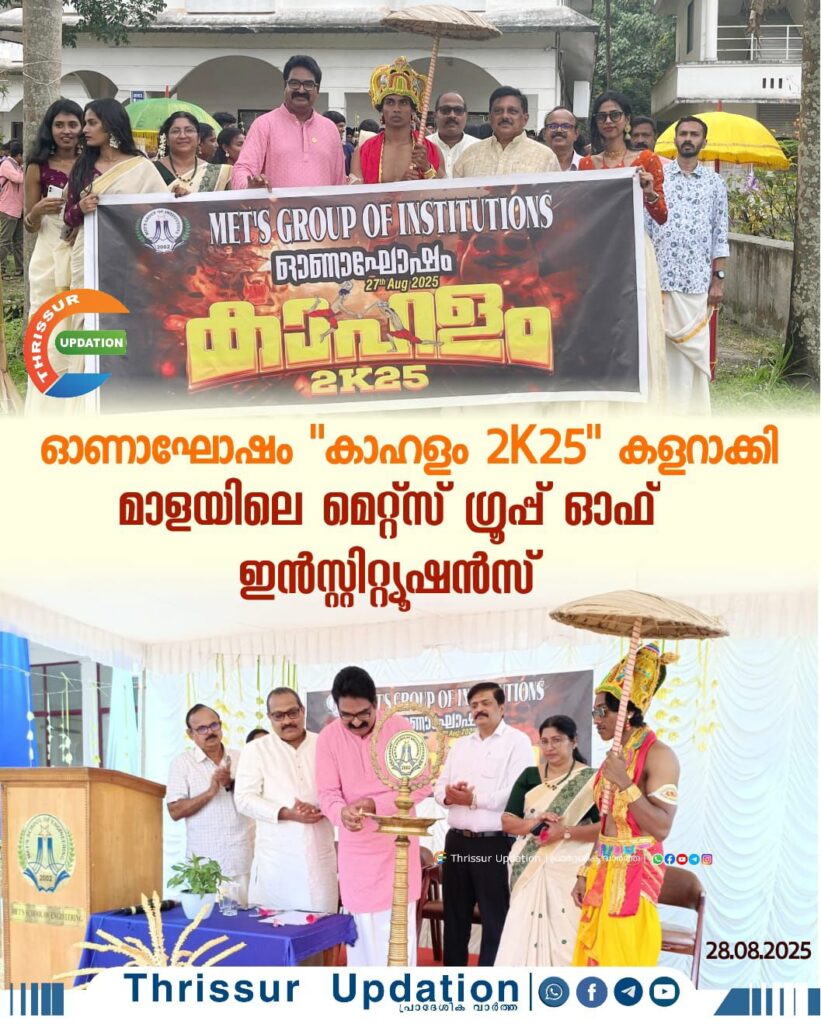 തൃശൂർ, മാള മെറ്റ്സ് ഗ്രൂപ്പ് ഓഫ് ഇൻസ്റ്റിറ്റ്യൂഷൻസ് സംഘടിപ്പിച്ച ഓണാഘോഷം “കാഹളം 2K25” നിറഞ്ഞോജസ്സോടെ അരങ്ങേറി. സി.ഇ.ഒ. പ്രൊഫ. (ഡോ.) ജോർജ്ജ് കോലഞ്ചേരി നിലവിളക്ക് കൊളുത്തി ഉദ്ഘാടനം നിർവഹിച്ചു.മെറ്റ്സ് സ്കൂൾ ഓഫ് എൻജിനീയറിങ്ങ്, മെറ്റ്സ് കോളേജ് ഓഫ് അഡ്വാൻസ്ഡ് സ്റ്റഡീസ്, മെറ്റ്സ് പോളിടെക്നിക് കോളേജ്, മെറ്റ്സ് കോളേജ് ഓഫ് ഫാർമസ്യൂട്ടിക്കൽ സയൻസസ് & റിസർച്ച് എന്നീ സ്ഥാപനങ്ങളുടെ സംയുക്താഭിമുഖ്യത്തിലാണ് പരിപാടികൾ സംഘടിപ്പിച്ചത്. മാള എഡ്യൂക്കേഷണൽ ട്രസ്റ്റ് ചെയർമാൻ ഡോ. ഷാജു ആൻറണി ഐനിക്കൽ ഘോഷയാത്രയ്ക്ക് നേതൃത്വം നൽകുകയും എല്ലാവർക്കും ഓണാശംസകൾ നേരുകയും ചെയ്തു. ചടങ്ങിൽ അക്കാദമിക് ഡയറക്ടർ ഡോ. എ. സുരേന്ദ്രൻ സ്വാഗതവും, സ്റ്റാഫ് കോർഡിനേറ്റർ പ്രൊഫ. ജോമോൾ നന്ദിയും പ്രകാശിപ്പിച്ചു. മെറ്റ്സ് കോളേജ് ഓഫ് അഡ്വാൻസ്ഡ് സ്റ്റഡീസ് പ്രിൻസിപ്പാൾ പ്രൊഫ. (ഡോ.) ഫോൺസി ഫ്രാൻസിസ്, ഫാർമസി കോളേജ് പ്രിൻസിപ്പാൾ പ്രൊഫ. (ഡോ.) ഷാജി ജോർജ്ജ്, അഡ്മിഷൻ ഡയറക്ടർ റിനോജ് ഖാദർ എന്നിവർ ആശംസകൾ അർപ്പിച്ചു സംസാരിച്ചു. 60 പെൺകുട്ടികൾ പങ്കെടുത്ത മെഗാ തിരുവാതിര പരിപാടി ഓണാഘോഷങ്ങൾക്ക് നിറം പകർന്നു.