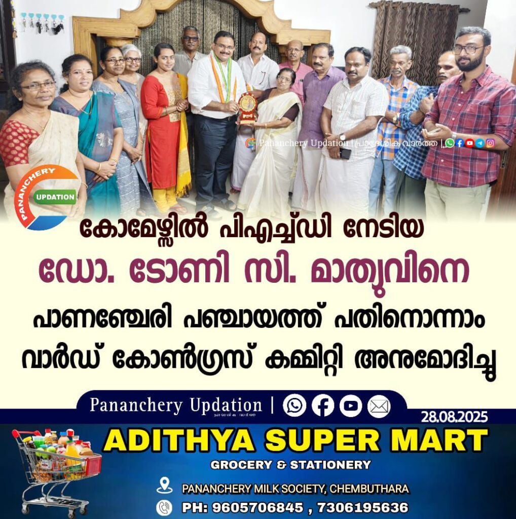കോമേഴ്സിൽ പിഎച്ച്ഡി നേടിയ ഡോ. ടോണി സി. മാത്യുവിനെ പാണഞ്ചേരി പഞ്ചായത്ത് പതിനൊന്നാം വാർഡ് കോൺഗ്രസ് കമ്മിറ്റി അനുമോദിച്ചു