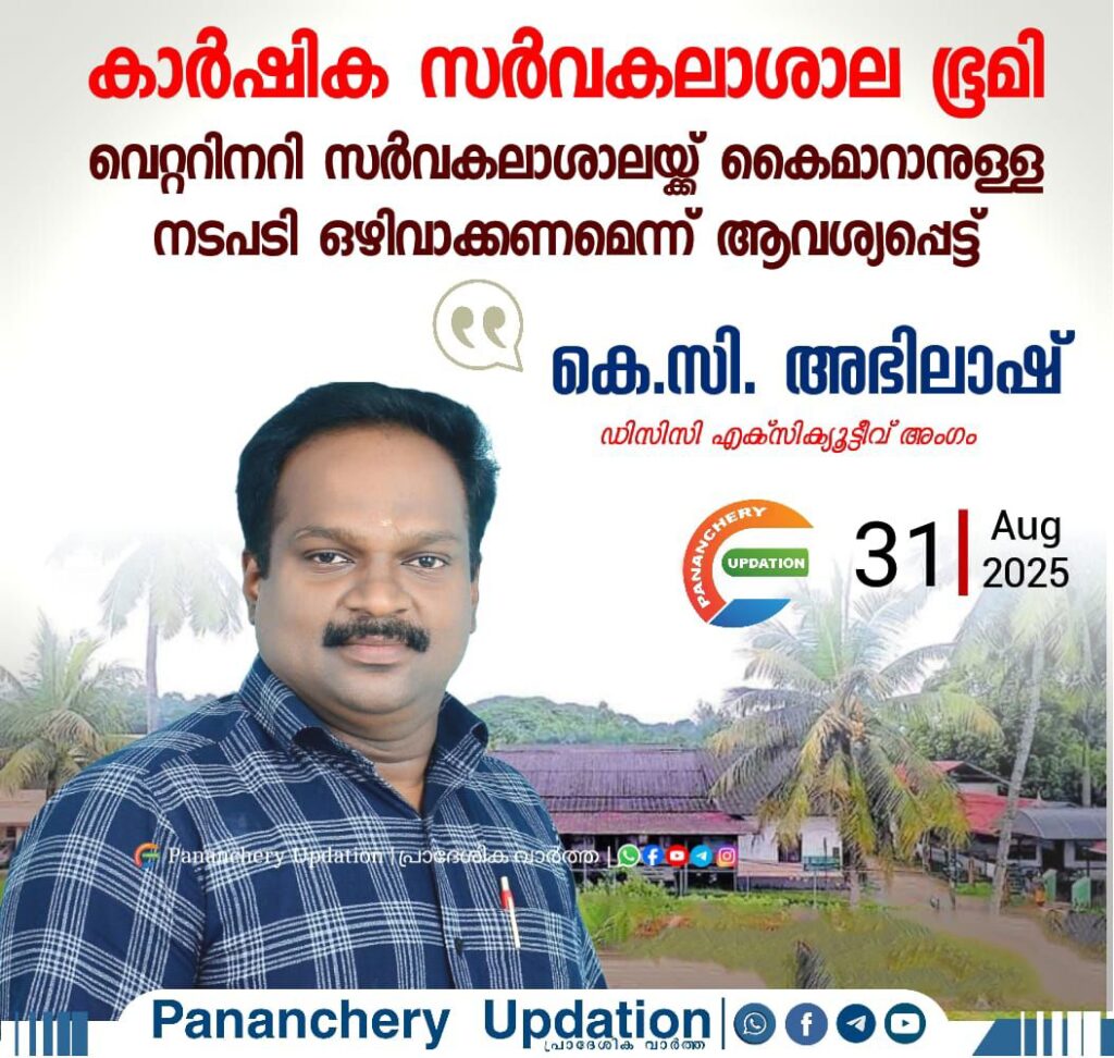 കാർഷിക സർവകലാശാല ഭൂമി വെറ്ററിനറി സർവകലാശാലയ്ക്ക് കൈമാറാനുള്ള നടപടി ഒഴിവാക്കണമെന്ന് ആവശ്യപ്പെട്ട് ഡിസിസി എക്സിക്യൂട്ടീവ് അംഗം കെ.സി. അഭിലാഷ്