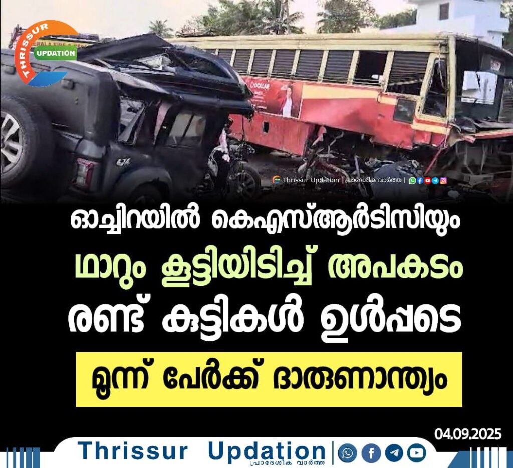കൊല്ലം ഓച്ചിറയിൽ കെഎസ്ആർടിസിയും ഥാറും കൂട്ടിയിടിച്ച് അപകടം; കുട്ടികൾ ഉൾപ്പെടെ മൂന്ന് പേർക്ക് ദാരുണാന്ത്യംഥാറിൽ ഉണ്ടായിരുന്ന സ്ത്രീയെ കരുനാഗപ്പള്ളിയിലെ സ്വകാര്യ ആശുപത്രിയില് പ്രവേശിപ്പിച്ചു. തേവലക്കര പൈപ്പ് മുക്ക് സ്വദേശികളാണ് ജീപ്പില് ഉണ്ടായിരുന്നത്.കെഎസ്ആര്ടിസി സൂപ്പര് ഫാസ്റ്റ് ബസും ഥാറും തമ്മില് കൂട്ടിയിടിച്ചാണ് അപകടം. ഥാര് ജീപ്പില് ഉണ്ടായിരുന്ന മൂന്ന് പേരാണ് മരിച്ചത്. നിരവധി പേര്ക്ക് പരിക്കേറ്റിട്ടുണ്ട്.