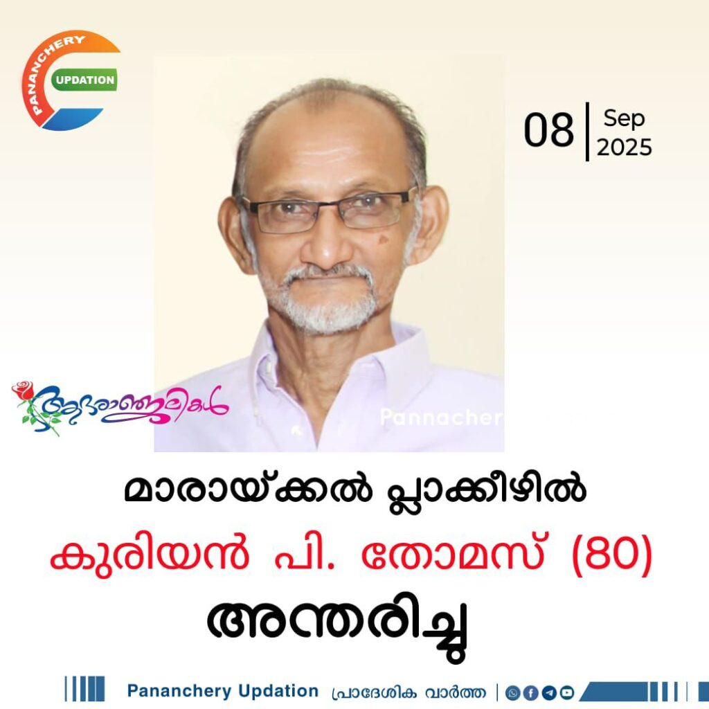 മാരായ്ക്കൽ പ്ലാക്കീഴിൽ കുരിയൻ പി. തോമസ് (ബേബി-80) അന്തരിച്ചു.സംസ്കാരം ബുധനാഴ്ച(10.09.2025) വൈകിട്ട് മൂന്നിന് കണ്ണാറ സെന്റ് തോമസ് പള്ളിയിൽ. ഭാര്യ: സാറാമ്മ കുര്യൻ. മക്കൾ: ബിന്ദു, സിന്ധു, തോമസ് (പീച്ചി സർവീസ് സഹകരണ ബാങ്ക് പ്രസിഡന്റ്). മരുമക്കൾ: പ്രിൻസ്, മാത്യൂസ്, ഷിബി.