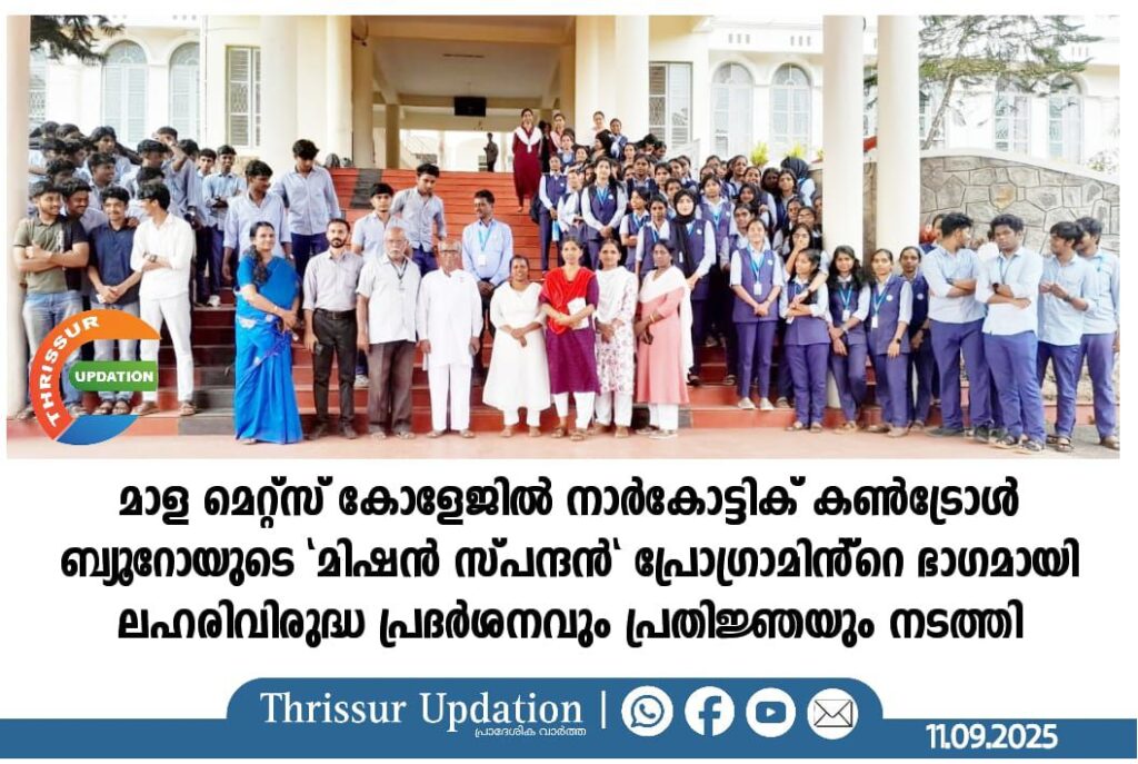മാള മെറ്റ്സ് കോളേജിൽ നാർകോട്ടിക് കൺട്രോൾ ബ്യൂറോയുടെ “മിഷൻ സ്പന്ദൻ” പ്രോഗ്രാമിൻ്റെ ഭാഗമായി ലഹരിവിരുദ്ധ പ്രദർശനവും പ്രതിജ്ഞയും നടത്തി