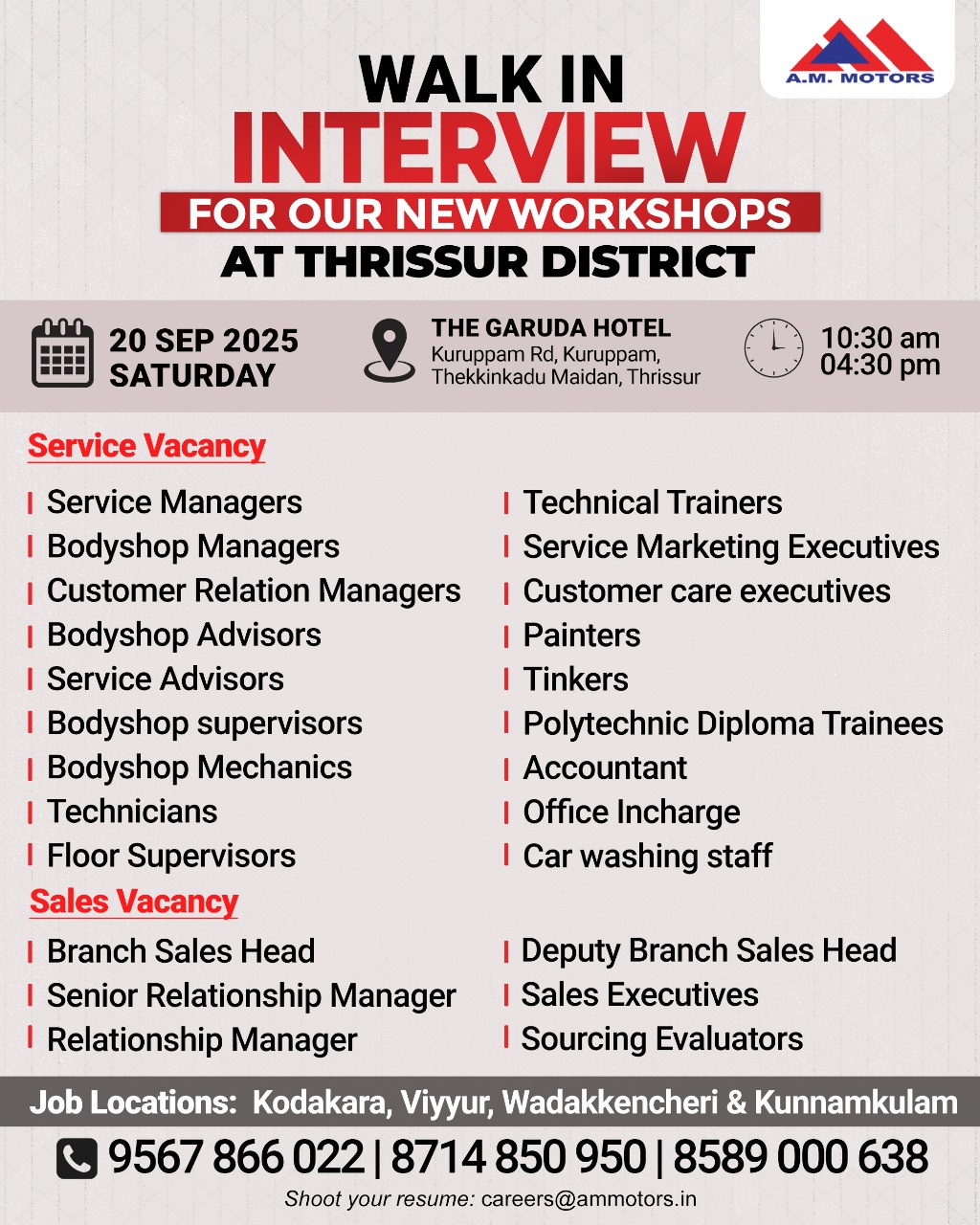 തൃശൂർ ജില്ലയിലെ കുന്നംകുളം, വിയ്യൂർ, വടക്കാഞ്ചേരി, കൊടകര എന്നിവിടങ്ങളിൽ AM MOTORS പുതുതായി ആരംഭിക്കുന്ന (NEXA & ARENA) സെയിൽസ് & സർവീസ് സെന്ററുകളിലേക്ക് 300ൽ പരം തൊഴിലവസരങ്ങൾ.