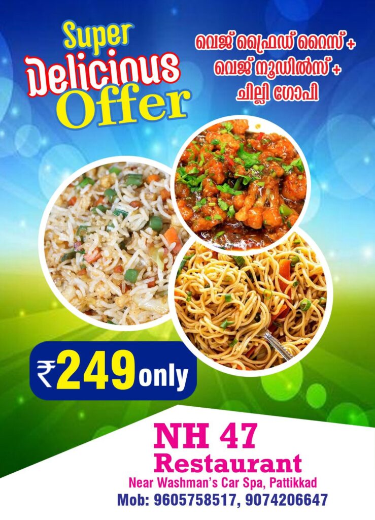 Local News NH 47 Restaurant😋🍲😋🫕😋🥘🍛🍴Special👉Boxer Rice 👉Chikken Rada By Author / September 18, 2025 Share this News Super Delicious Offer🍜😋വെജ് ഫ്രൈഡ് റൈസ് + വെജ് ന്യൂഡിൽസ് + ചില്ലി ഗോപി – ₹ 250 only10 പൊറോട്ട + ചില്ലി ചിക്കൻ-₹ 199onlyΝΗ 47 Restaurant📍Near Washman’s Car Spa, Pattikkad📞9074206647 Post Views: 152 Post navigation Previous മാള മെറ്റ്സ് കോളജിൽ “ആന്റി-ഡ്രഗ് അവബോധന പ്രോഗ്രാം” സംഘടിപ്പിച്ചുNext വിലങ്ങന്നൂർ പായ്ക്കണ്ടം പുലിപ്ര ജോസ് തോമസ് (64) അന്തരിച്ചു