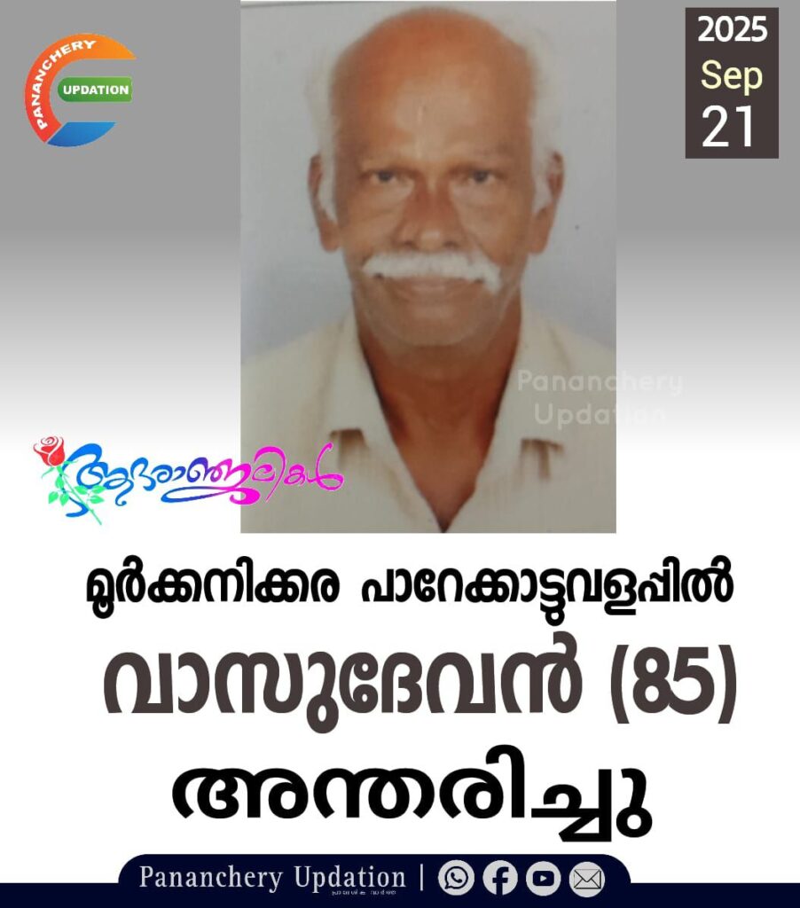 മൂർക്കനിക്കര പാറേക്കാട്ടുവളപ്പിൽ വാസുദേവൻ (85)അന്തരിച്ചു.