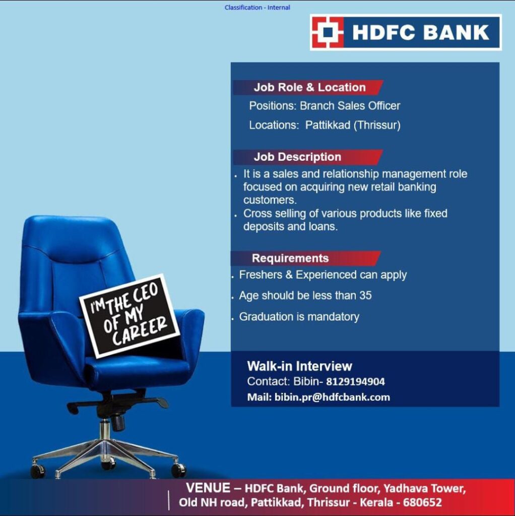 Local News ജോലി ഒഴിവ് By Author / September 21, 2025 Share this News HDFC BANK ൻ്റെ പട്ടിക്കാട് ബ്രാഞ്ചിൽ *SALE OFFICER* ഒഴിവ് . സെയിൽസിൽ പ്രവർത്തി പരിചയമുള്ളവർക്ക് മുൻഗണന. താൽപര്യമുള്ളവർ താഴെ കാണുന്ന നമ്പറിൽ വിളിക്കുക👇8129194904 Post Views: 211 Post navigation Previous നടത്തറ ഗ്രാമപഞ്ചായത്തിലെ മത്സ്യ കർഷകർക്കായുള്ള കാർപ്പ് മത്സ്യകുഞ്ഞുങ്ങളുടെ വിതരണോദ്ഘാടനം ഒല്ലൂക്കര ബ്ലോക്ക് പഞ്ചായത്ത് പ്രസിഡൻ്റ് കെ. ആർ . രവി നിർവഹിച്ചു.Next മാരായ്ക്കൽ കല്ലറക്കൽ അനിയൻ കുഞ്ഞ് ഭാര്യ ഓമന(65) അന്തരിച്ചു