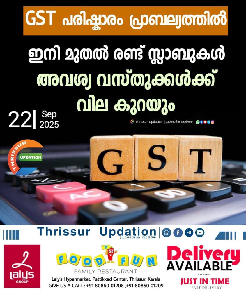രാജ്യത്ത് GST പരിഷ്കാരം പ്രാബല്യത്തിൽ വന്നു. നാല് സ്ലാബുകളുള്ളത് രണ്ടായി കുറയുമ്പോൾ ജനങ്ങൾക്ക് അത് വലിയ നേട്ടമുണ്ടാകുമെന്നാണ് വിലയിരുത്തൽ.പാൽ, പനീർ മുതൽ തേയില, കാപ്പിപ്പൊടി അടക്കം കുഞ്ഞു കാറുകൾക്കു വരെ വലിയ വിലക്കുറവാണ് പ്രതീക്ഷിക്കുന്നത്. ഇളവുകൾ ജനങ്ങൾക്കുള്ള നവരാത്രി സമ്മാനമെന്ന് പ്രധാനമന്ത്രി നരേന്ദ്രമോദി.5ശതമാനം 12ശതമാനം 18ശതമാനം 28ശതമാനം എന്നീ നാല് ജിഎസ്ടി സ്ലാബുകൾ ഇന്നു മുതൽ പഴങ്കഥയാവുകയാണ്. ഇനി മുതൽ അഞ്ച് ശതമാനവും പതിനെട്ട് ശതമാനവും മാത്രമാണ് ജിഎസ്ടി സ്ലാബുകൾ. പുതിയ പരിഷ്കരണം പ്രാബല്യത്തിൽ വരുന്നതോടെ അവശ്യ വസ്തുക്കളായ പാലും പനീറും ഉൾപ്പെടെ നിരവധി വസ്തുക്കൾക്ക് ജിഎസ്ടി ഉണ്ടാകില്ല എന്നത് സന്തോഷം നൽകുന്ന വിവരമാണ്. നെയ് മുതൽ പനീർ വരെ 700 ഉത്പന്നങ്ങൾക്ക് വില കുറച്ചെന്ന് അമുൽ അറിയിച്ചു.