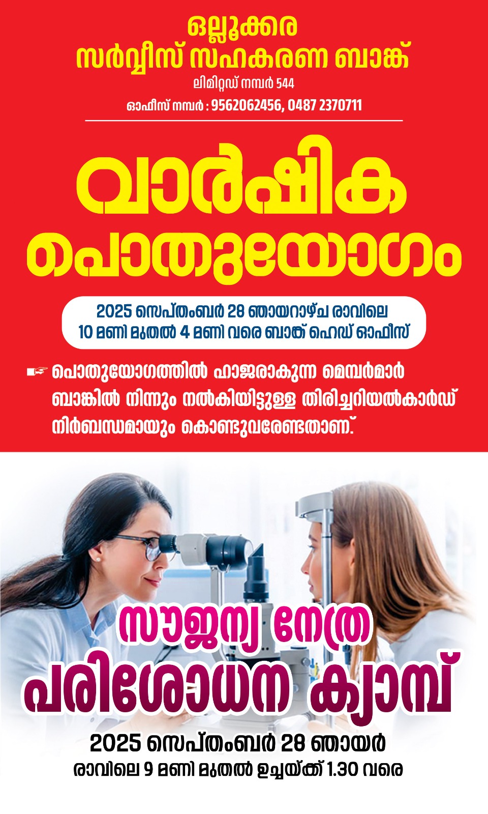 ഒല്ലൂക്കര സർവ്വീസ് സഹകരണ ബാങ്ക് ലിമിറ്റഡ് നമ്പർ 544 വാർഷിക പൊതുയോഗം 2025 സെപ്തംബർ 28 ഞായറാഴ്ച രാവിലെ 10 മണി മുതൽ 4 മണി വരെ ബാങ്ക് ഹെഡ് ഓഫീസിൽ നടത്തുന്നു. പൊതുയോഗത്തിൽ ഹാജരാകുന്ന മെമ്പർമാർ ബാങ്കിൽ നിന്നും നൽകിയിട്ടുള്ള തിരിച്ചറിയൽകാർഡ് നിർബന്ധമായും കൊണ്ടുവരേണ്ടതാണ്.