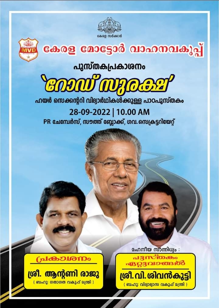 ഹയർ സെക്കൻററി വിദ്യാർത്ഥികളിൽ റോഡ് നിയമങ്ങളെക്കുറിച്ചും മറ്റും അവബോധം സൃഷ്ടിക്കുന്നതിനും, പാഠ്യപദ്ധതിയിൽ ഉൾപ്പെടുത്തുന്നതിനും മോട്ടോർ വാഹന വകുപ്പ് തയ്യാറാക്കിയ പുസ്തകം ഗതാഗതവകുപ്പ് മന്ത്രി ആൻറണി രാജു, വിദ്യാഭ്യാസ വകുപ്പ് മന്ത്രി വി. ശിവൻകുട്ടിക്ക് സെക്രട്ടറിയേറ്റിലെ പി. ആർ. ചേംബറിൽ വച്ച് കൈമാറും.