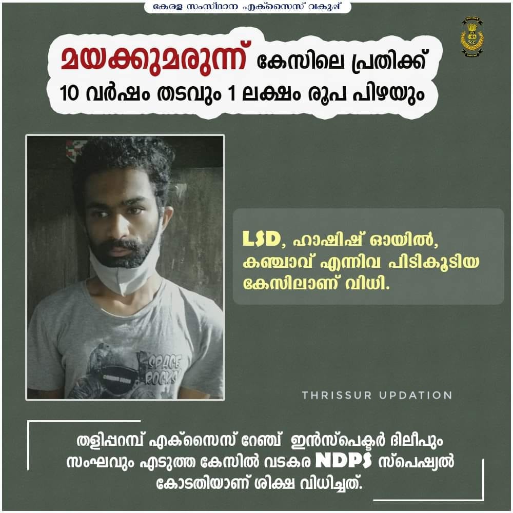 തളിപ്പറമ്പ് റെയിഞ്ച് ഇൻപെക്ടർ ദിലിപ് എം ഉം പാർട്ടിയും കണ്ടെടുത്ത തുടർച്ചയായ രണ്ടാമത്തെ കേസിലാണ് കോടതി 10 വർഷം തടവും പിഴയും ശിക്ഷ വിധിക്കുന്നത് സെപ്റ്റംബർ ആദ്യ വാരത്തിൽ ന്യൂ ഇയർ പാർട്ടിക്കായി മയക്കുമരുന്ന് എത്തിച്ച തളിപ്പറമ്പ് മന്ന സ്വദേശി സമീർഅലി, നരിക്കോട് സ്വദേശി ത്വയിബ് എന്നിവരെ ഇതേ മാതൃകയിൽ കോടതി ശിക്ഷിച്ചിരുന്നു.