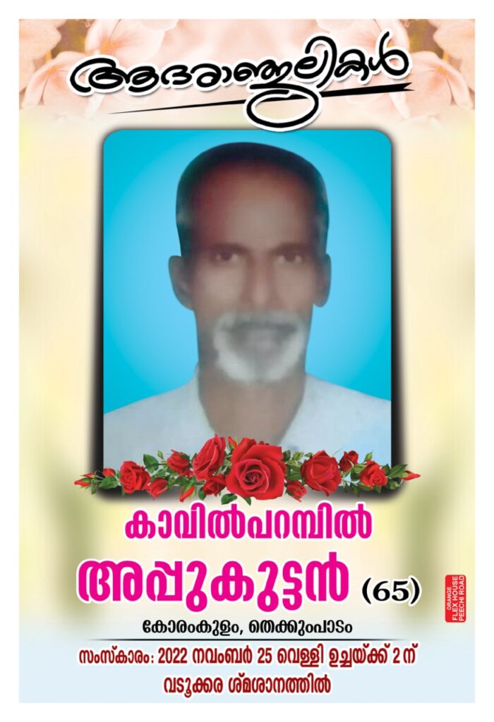 തെക്കുംപാടം കോരംകുളം കാവിൽപറമ്പിൽ അപ്പുക്കുട്ടൻ (65) അന്തരിച്ചു. സംസ്ക്കാരം ഇന്ന് (25-11-2022) വെള്ളിയാഴ്ച ഉച്ചയ്ക്ക് 2 ന് വടൂക്കര ശ്മശാനത്തിൽ. ഭാര്യ : രാജമ്മ