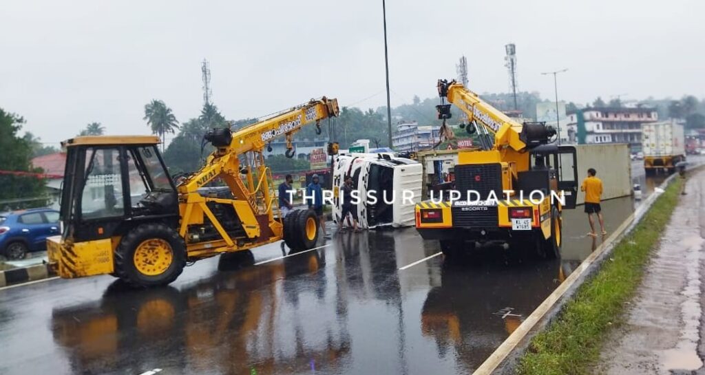 എറണാംകുളത്ത് നിന്നും തൃശ്ശൂർ ഭാഗത്തേക്ക് പോകുന്ന ട്രാക്കിലേക്കാണ് ട്രൈയിലർ മറിഞ്ഞത്. ഏകദേശം ഒരു മണിക്കൂറോളം ഗതാഗതക്കുരുക്ക് അനുഭവപ്പെട്ടു ദേശീയപാതയിൽ .രണ്ട് ക്രൈയിനുകൾ ഉപയോഗിച്ചാണ് ട്രൈയ്ലർ ഉയർത്തിയത്. കാലത്ത് 10 മണിയോട് കൂടിയാണ് അപകടം ഉണ്ടായത്.