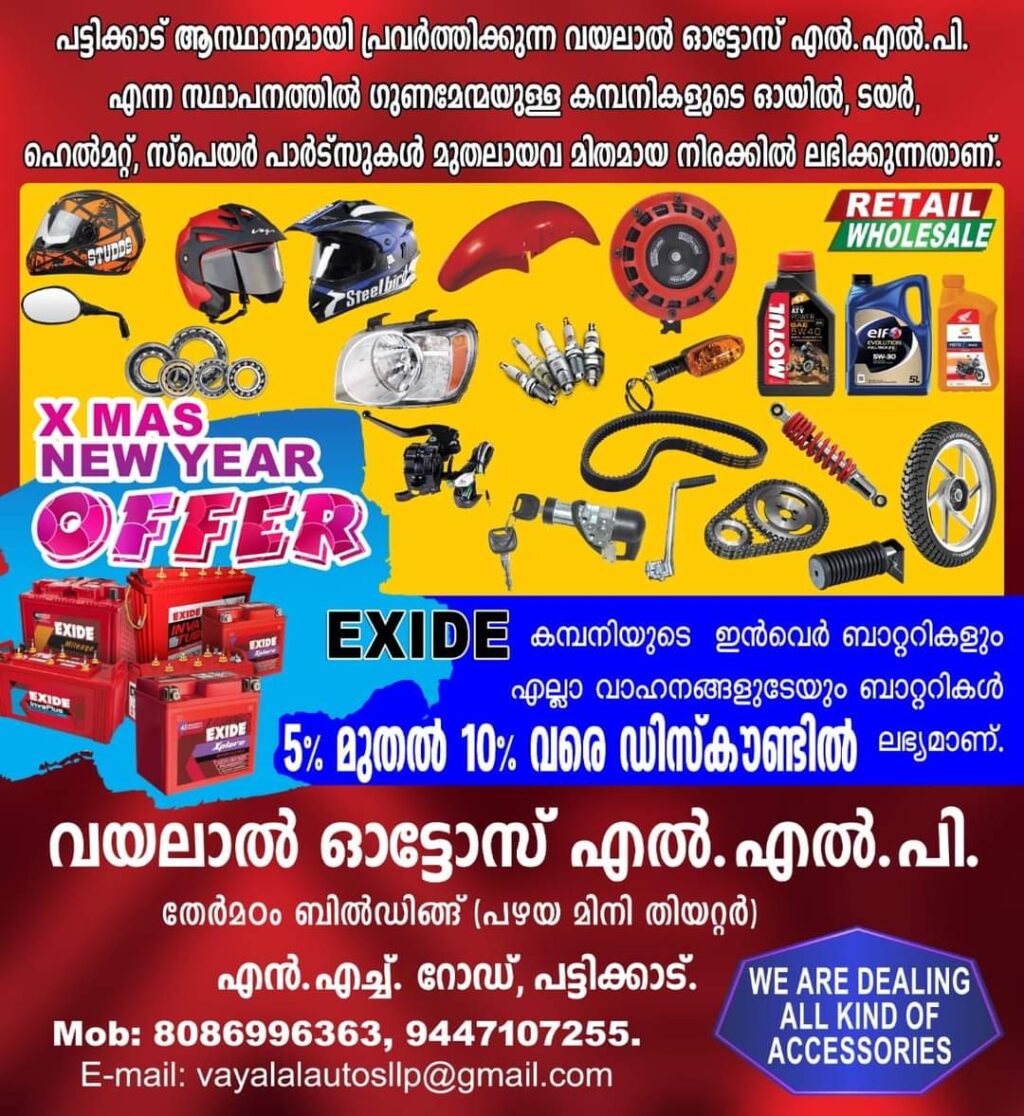 പട്ടിക്കാട് ആസ്ഥാനമായി പ്രവർത്തിക്കുന്ന വയലാൽ ഓട്ടോസ് എൽ.എൽ.പി. എന്ന സ്ഥാപനത്തിൽ ഗുണമേന്മയുള്ള കമ്പനികളുടെ ഓയിൽ, ടയർ,ഹെൽമറ്റ്, സ്പെയർ പാർട്സുകൾ മുതലായവ മിതമായ നിരക്കിൽ ലഭിക്കുന്നതാണ്.